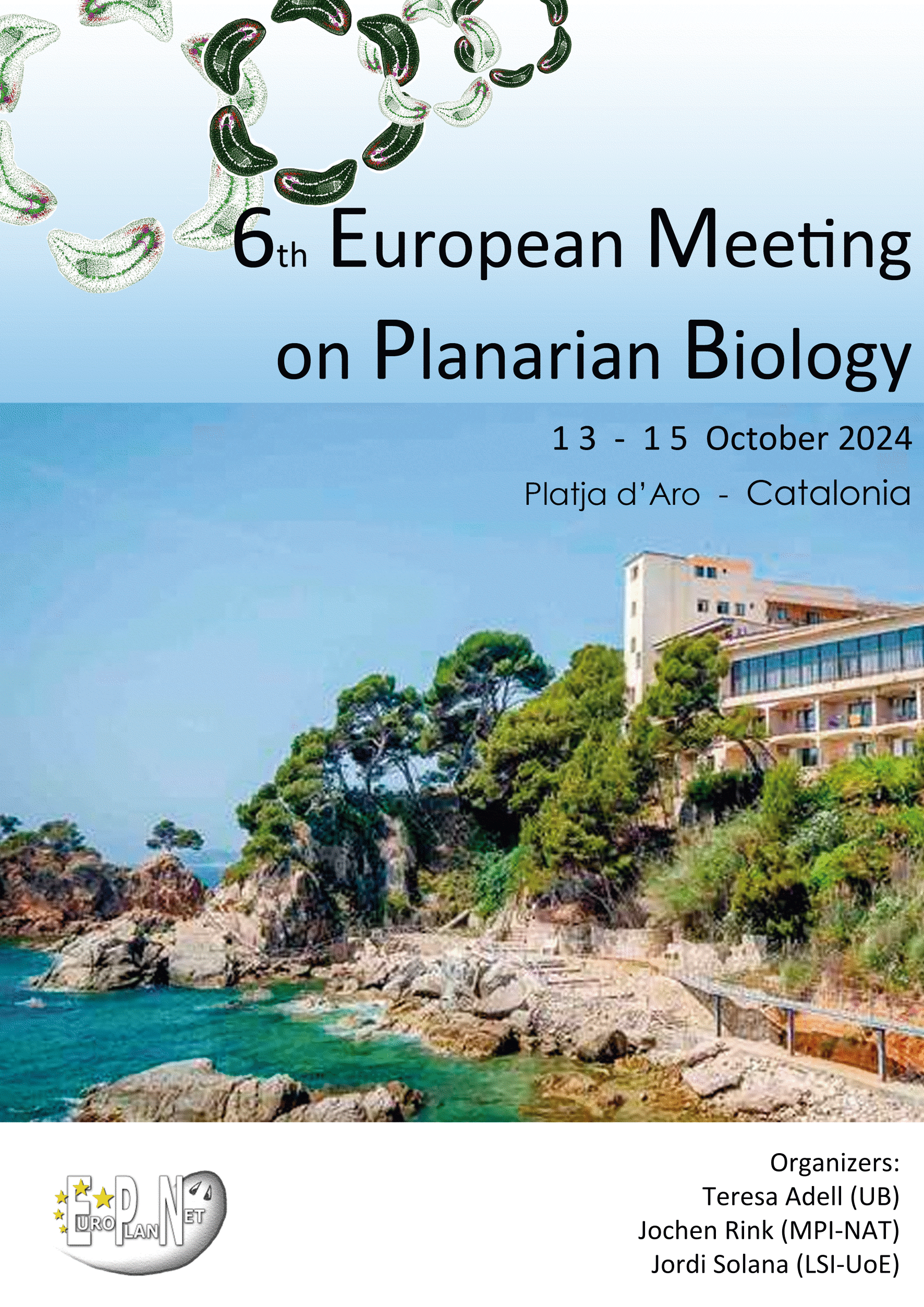 The 6th European Meeting on Planarian Biology that is going to take place from October 13th to 15th, 2024, at Hotel Cap Roig in Platja d'Aro, Catalonia. In line with previous editions, such as EMPB2022, the aim of the meeting is to bring together the European planarian research community to discuss recent advances in flatworm biology, to exchange tips and tricks and to strengthen the links and collaborations between all labs.