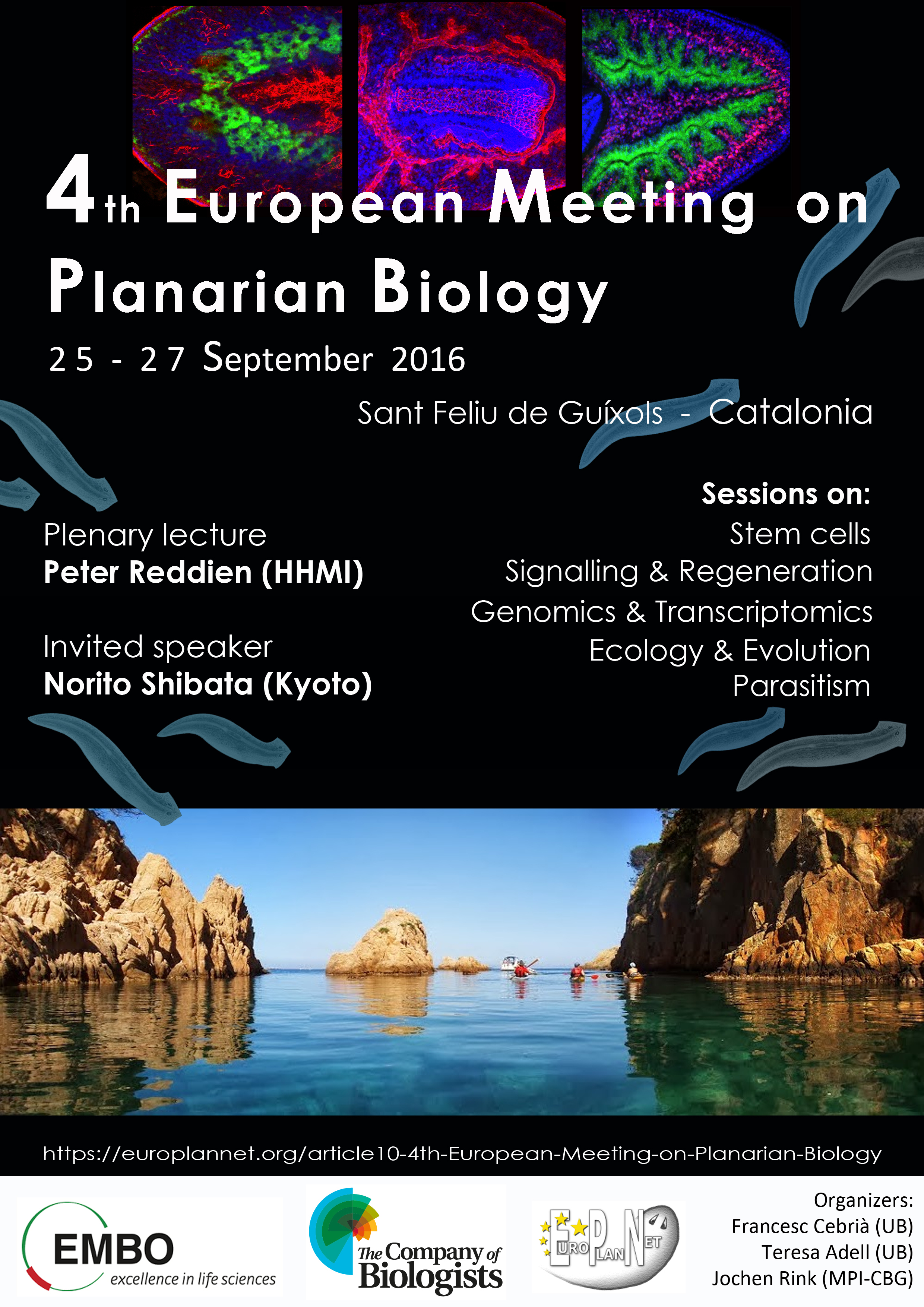 The 4th European Meeting on Planarian Biology (EMPB2016) took place from September 25th to 27th, 2016, at Hotel Eden Roc in Sant Feliu de Guixols, Catalonia. The meeting continued the tradition of the Münster meeting in 2010, the Kyoto meeting in 2011, the Dresden meeting in 2013, and the planarian workshop within the ISFB at Oxford in 2015.